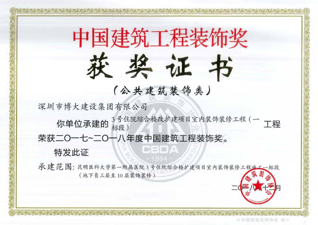 博大建設集團承建的昆明醫科大學第一附屬醫院3號樓、華遠金外灘四期君悅酒店、綠景虹灣裙樓商業公共部分、水貝金座大廈幕墻工程、天健科技大廈幕墻工程等5個經典工程以卓越品質榮獲中國建筑工程裝飾獎。