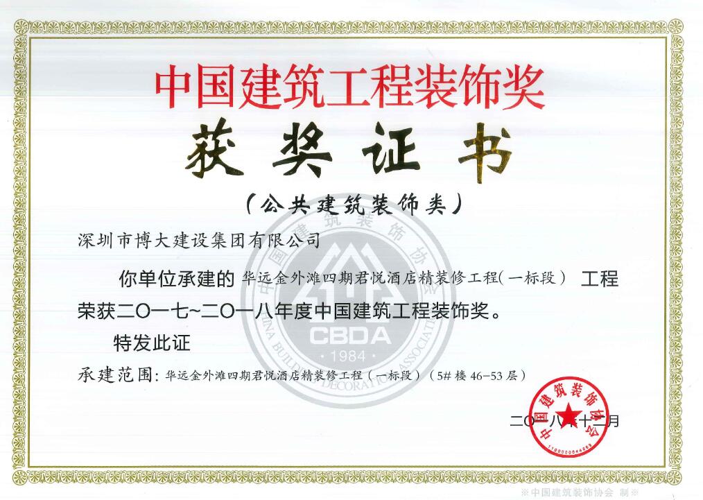 博大施工團隊憑借豐富的五星級酒店裝飾裝修經驗,相繼克服了材料二次運輸及周轉繁瑣、施工空間受限、垂直運輸、供材的不確定性等困難,完美達到裝修預期效果,得到客戶和行業的高度認可,榮獲中國建筑工程裝飾獎。