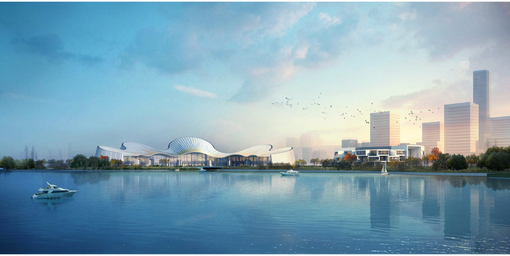 大劇院沿湖一側(cè),起伏的屋面,舒展流暢,宛如兩架協(xié)奏的鋼琴,樂(lè)聲悠揚(yáng)。又如一只翩翩起舞的紙鸞乘風(fēng)欲起。
