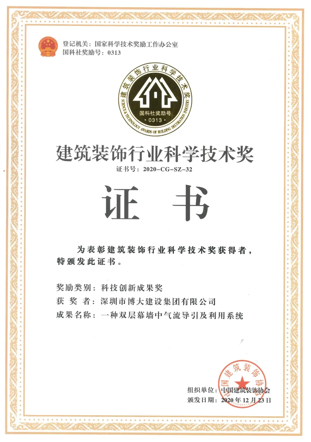 博大研發(fā)的一種雙層幕墻中氣流導(dǎo)引及利用系統(tǒng)創(chuàng)新技術(shù)榮獲二0二0年全國建筑行業(yè)科技創(chuàng)新成果獎(jiǎng)。