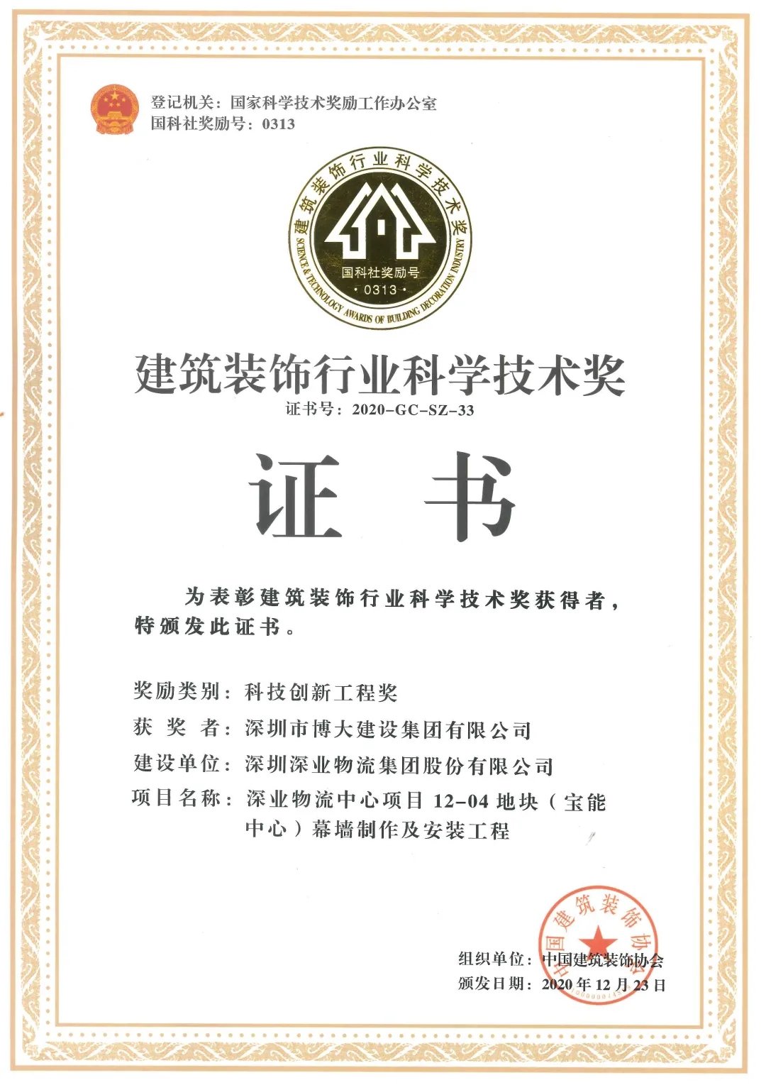博大建設(shè)集團(tuán)承建的“深業(yè)物流12-04地塊(寶能中心幕墻制作及安裝工程)”榮獲二0二0年全國建筑行業(yè)科技創(chuàng)新工程獎(jiǎng)。