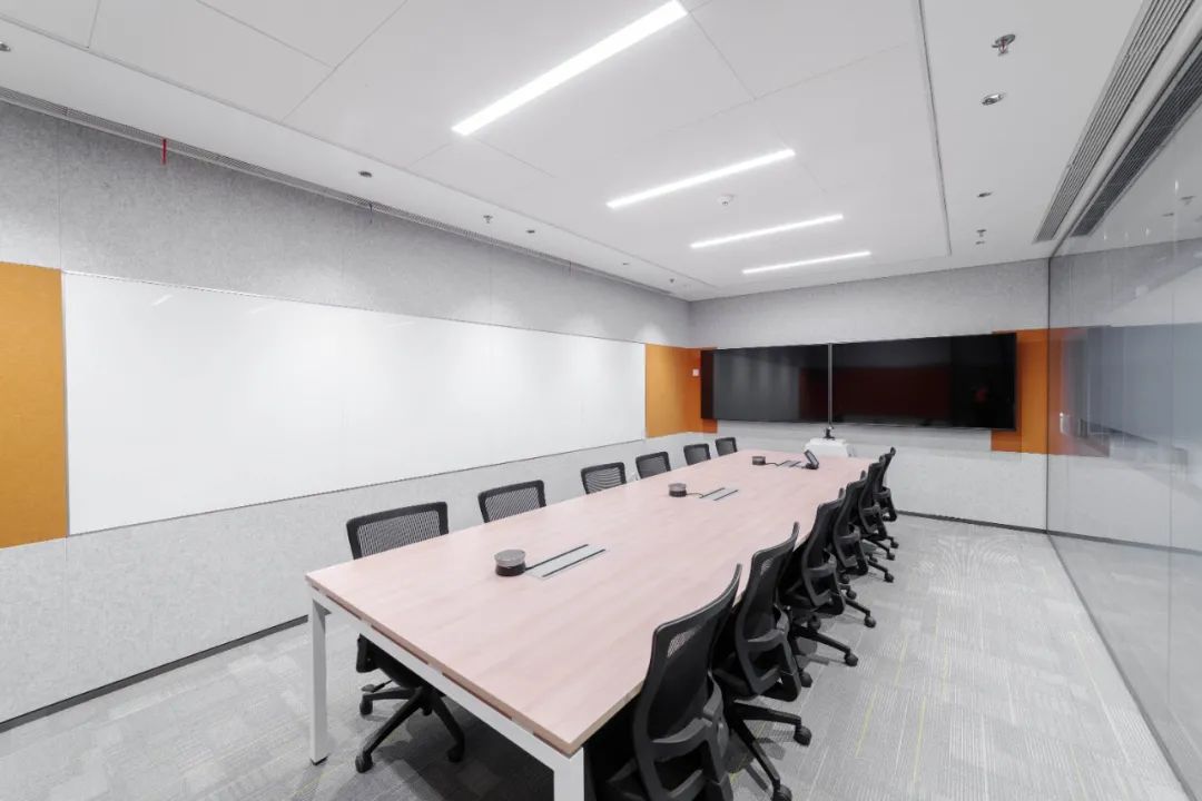 天花采用鋁方通格柵吊頂和開放式原頂噴涂,增加了平面導(dǎo)向性,提升了天花空間,降低了多種裝飾材料堆積造成的空氣污染,營造綠色環(huán)保的辦公環(huán)境。