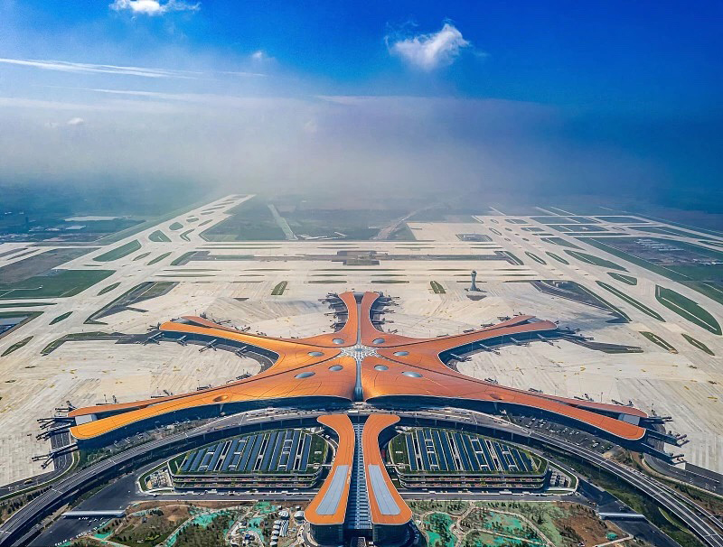 北京大興國際機場航站樓形如展翅的鳳凰,五指廊的造型完全以旅客為中心。整個航站樓有82個登機口,但是旅客從航站樓中心步行到達任何一個登機口,所需的時間不超過8分鐘。博大建設集團承建了中南指廊國際出發到達區域室內裝飾工程。
